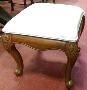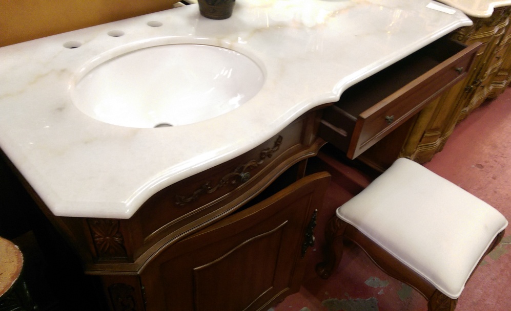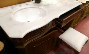 This traditional style 52 inch wide Make up Sink Vanity ships as shown with solid slab of white Marble Stone Top and includes the Makeup bench